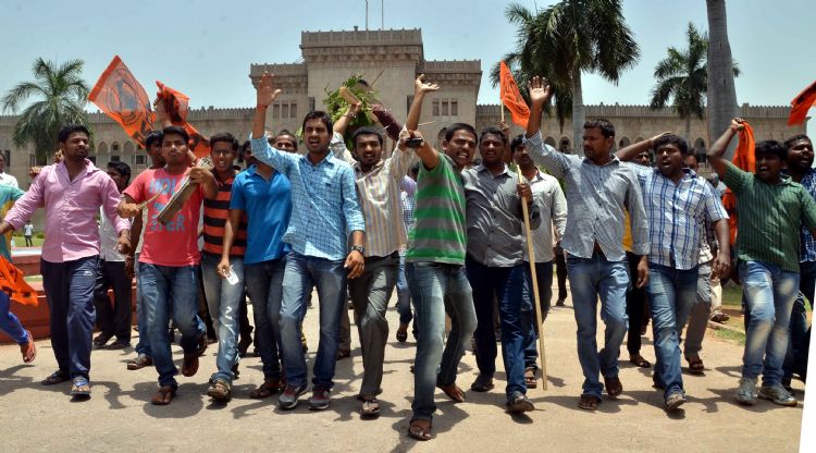 Student Organisations in Osmania University protesting against Chief Minister K. Chandrasekhar Rao proposal of University Land allotment to houses for poor people and burnt effigy of KCR on May 20, 2015.