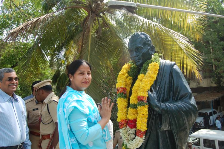 Prakasam District Collector Sujatha Sharma garlending Tanguturi Prakasam Panthulu Statue located in Collectorate on the account of 58th death anniversary on May 20, 2015.