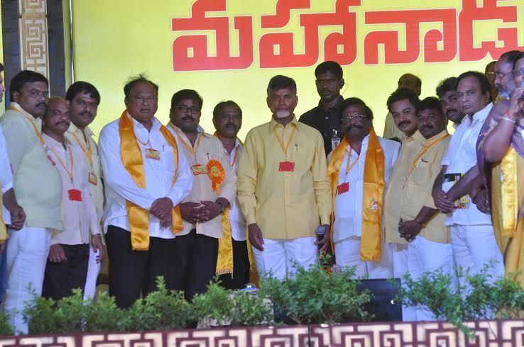 Andhra Pradesh Chief Minister and TDP President N Chandrababu Naidu with Prakasam District TDP MLAs and other leaders in Mahanadu 2015 on second day on May 28, 2015.