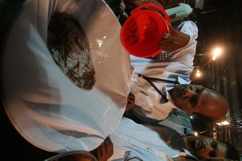 The miracle fish medicine, which cures asthma and respiratory illnesses and administered free of cost by the famous Bathini brothers of Dhoodhbowli, will be distributed at the "Exhibition grounds" in Nampally, Hyderabad. According to latest new from BATHINI BROTHERS This Year the Bathini Mrugasira Fish administering date (Mrigasira Karthi) falls on 8th June 2015 at 11:45pm(Night) It shall be administered 24 hrs non-stop i.e. up to 9th June 2015 11:45pm.