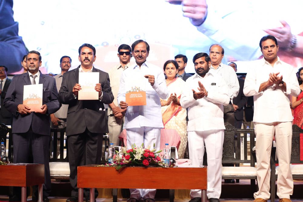 Chief Minister K. Chandrashekhar Rao launching Telangana Industrial Policy 2015 at HICC on June 12, 2015.