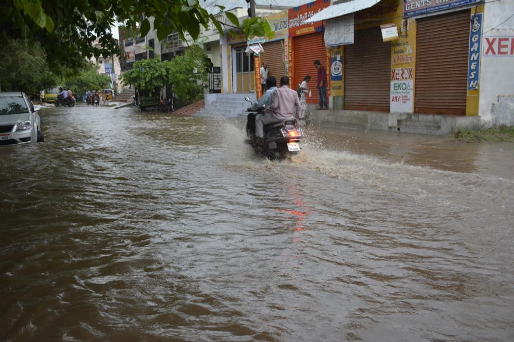 Pedestrians walk through the flooded streets after heavy rain lashed Hyderabad on June 12, 2015.