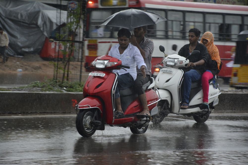 Pedestrians walk through the flooded streets after heavy rain lashed Hyderabad on June 12, 2015.