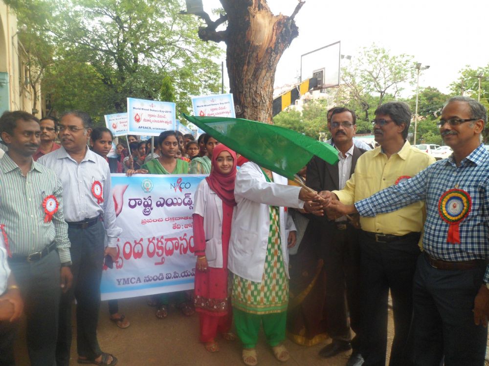 World Blood Donor Day was observed on 14th June.15, Rally started at YMCA, Narayanguda with about 300 students that was flagged off by Dr. Amarinder Reddy, Director, IPM, Dr. Padmaja, DM & HO, Hyderabad and Dr. Satyanarayana Reddy, State Liaision Officer, NSS, followed by a meeting, which was organized by State AIDS Control Society, Andhra Pradesh and Telangana in association with State blood Transfusion Council, Hyderabad.