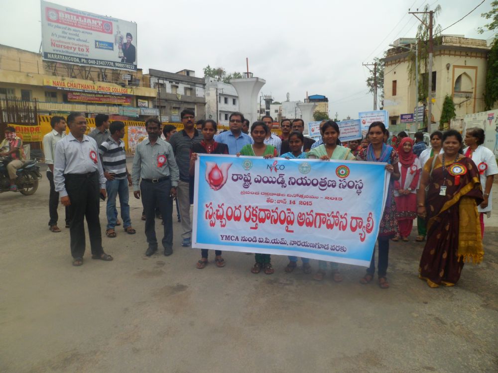 World Blood Donor Day was observed on 14th June.15, Rally started at YMCA, Narayanguda with about 300 students that was flagged off by Dr. Amarinder Reddy, Director, IPM, Dr. Padmaja, DM & HO, Hyderabad and Dr. Satyanarayana Reddy, State Liaision Officer, NSS, followed by a meeting, which was organized by State AIDS Control Society, Andhra Pradesh and Telangana in association with State blood Transfusion Council, Hyderabad.