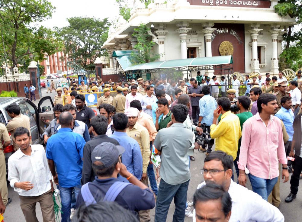 Journalist demonstration at Secretariat against Andhra Pradesh Government serving notice to the Telangana News Channel on June 20, 2015.