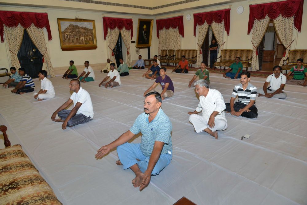 Governor of Telangana and Andhra Pradesh E.S.L. Narasimhan taking the lead in organising the first International Yoga Day celebrations at Raj Bhavan in Hyderabad on Sunday.