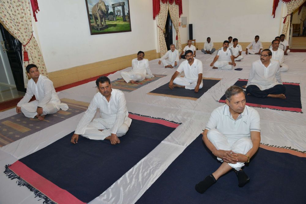 Governor of Telangana and Andhra Pradesh E.S.L. Narasimhan taking the lead in organising the first International Yoga Day celebrations at Raj Bhavan in Hyderabad on Sunday.