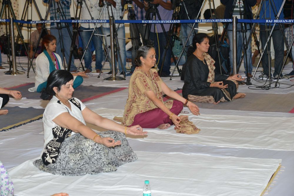 Governor of Telangana and Andhra Pradesh E.S.L. Narasimhan taking the lead in organising the first International Yoga Day celebrations at Raj Bhavan in Hyderabad on Sunday.
