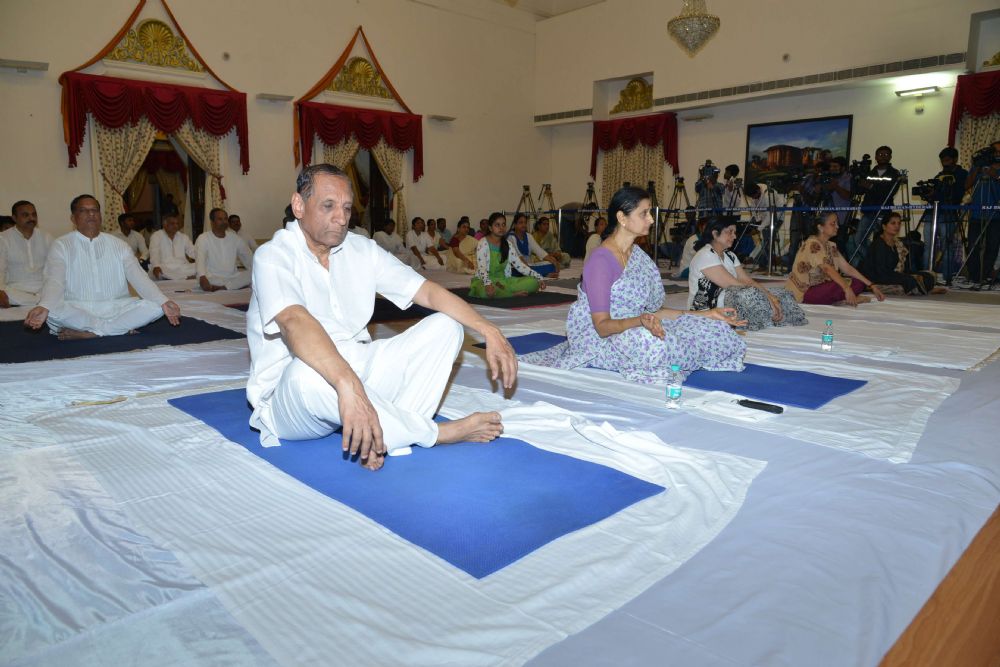 Governor of Telangana and Andhra Pradesh E.S.L. Narasimhan taking the lead in organising the first International Yoga Day celebrations at Raj Bhavan in Hyderabad on Sunday.
