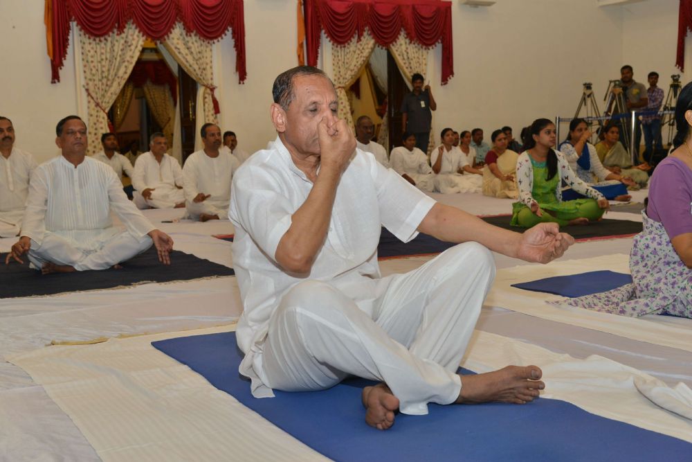 Governor of Telangana and Andhra Pradesh E.S.L. Narasimhan taking the lead in organising the first International Yoga Day celebrations at Raj Bhavan in Hyderabad on Sunday.