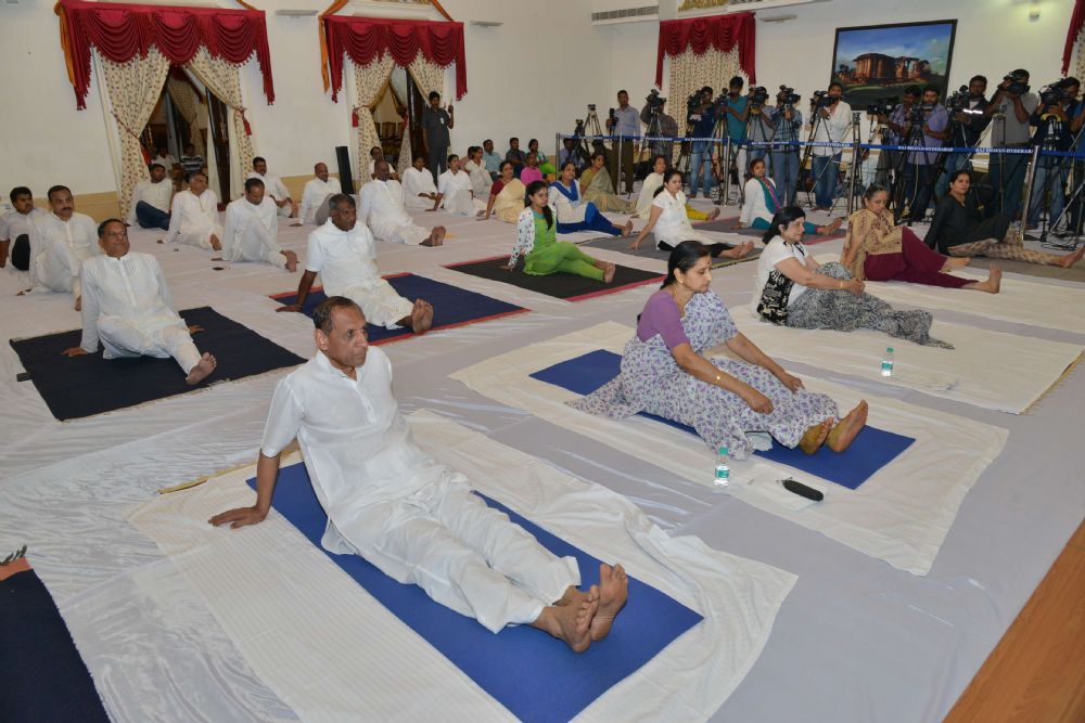 Governor of Telangana and Andhra Pradesh E.S.L. Narasimhan taking the lead in organising the first International Yoga Day celebrations at Raj Bhavan in Hyderabad on Sunday.