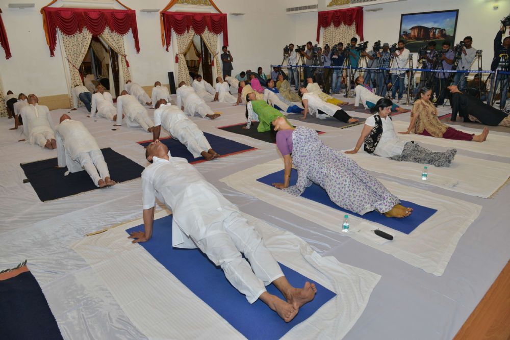 Governor of Telangana and Andhra Pradesh E.S.L. Narasimhan taking the lead in organising the first International Yoga Day celebrations at Raj Bhavan in Hyderabad on Sunday.