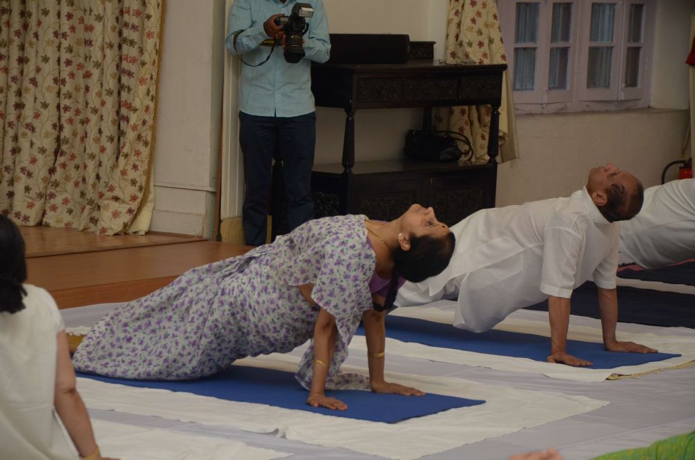 Governor of Telangana and Andhra Pradesh E.S.L. Narasimhan taking the lead in organising the first International Yoga Day celebrations at Raj Bhavan in Hyderabad on Sunday.