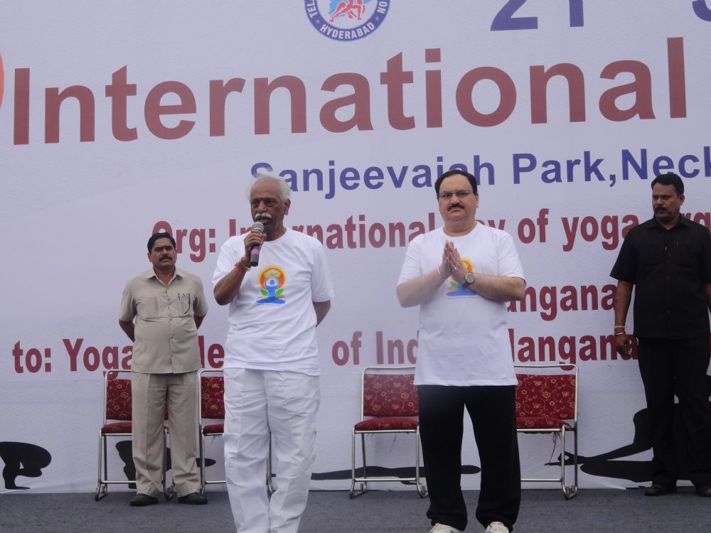 The first International Yoga Day celebrations got off to a rousing start in Hyderabad on Sunday. Central Ministers Sujana Chowdary, Bandaru Datthathreya, M Venkaiah Naidu participated in Yoga Day Celebrations.