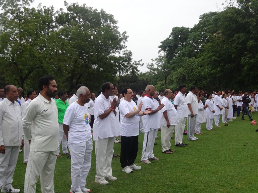 The first International Yoga Day celebrations got off to a rousing start in Hyderabad on Sunday. Central Ministers Sujana Chowdary, Bandaru Datthathreya, M Venkaiah Naidu participated in Yoga Day Celebrations.