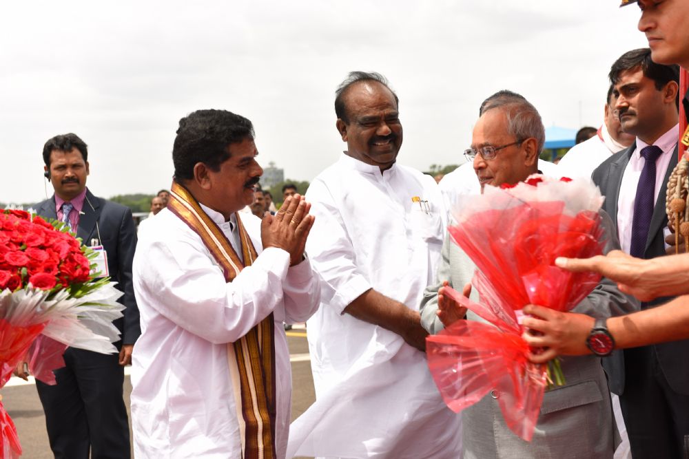 Chief Minister K.Chandrashekhar Rao, Governor ESL.Narasimhan bidding farewell to the President of India Pranab Mukherjee at Hakimpet Airport Hyderabad on 8th July 2015.