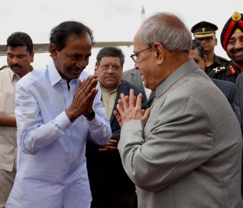 Chief Minister K.Chandrashekhar Rao, Governor ESL.Narasimhan bidding farewell to the President of India Pranab Mukherjee at Hakimpet Airport Hyderabad on 8th July 2015.