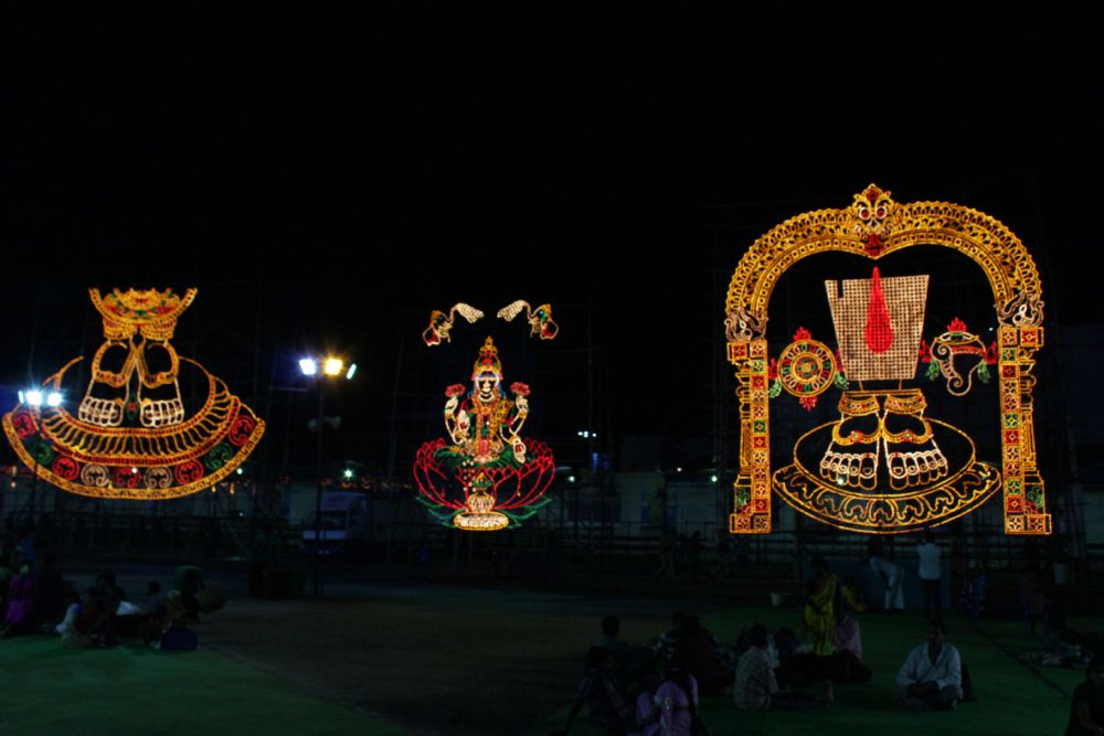 The sky in the Municipal Ground premises in Rajamundry attained a new look during the nights out of the illuminations emanated from the huge electrical cut outs set by electrical wing of TTD for the occasion.
