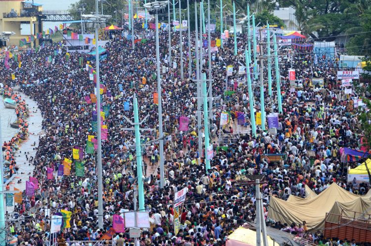 Huge crowd hits Kotilingala Ghat to take a holy dip and perform rituals on the sixth day of Godavari Mahapushkarams in Rajahmundry on Sunday.