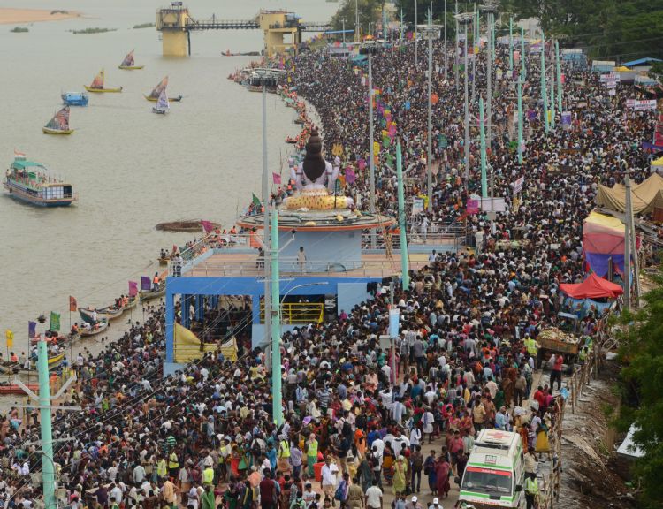 Huge crowd hits Kotilingala Ghat to take a holy dip and perform rituals on the sixth day of Godavari Mahapushkarams in Rajahmundry on Sunday.