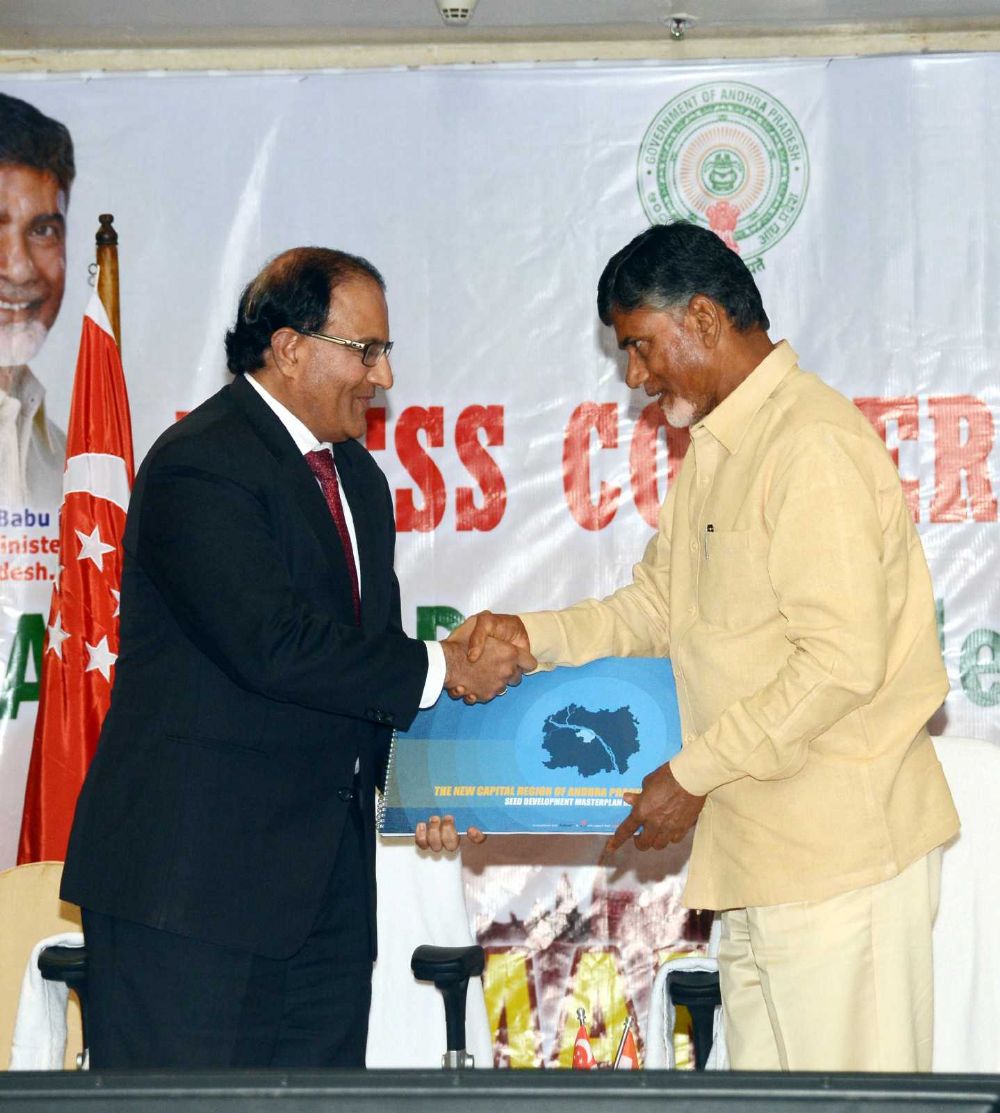 Singapore Second Minister for Trade and Industry S. Iswaran and his team visited Rajahmundry and handling over the Amaravathi Master Plan to CM Chandrabau Naidu on Monday.