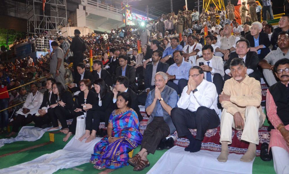 The Singapore team, headed by Second Minister S Iswaran accompanied by Chief Minister N Chandrababu Naidu, witnessed the sacred Godavari Harathi in Rajahmundry Pushkar Ghat on Monday.