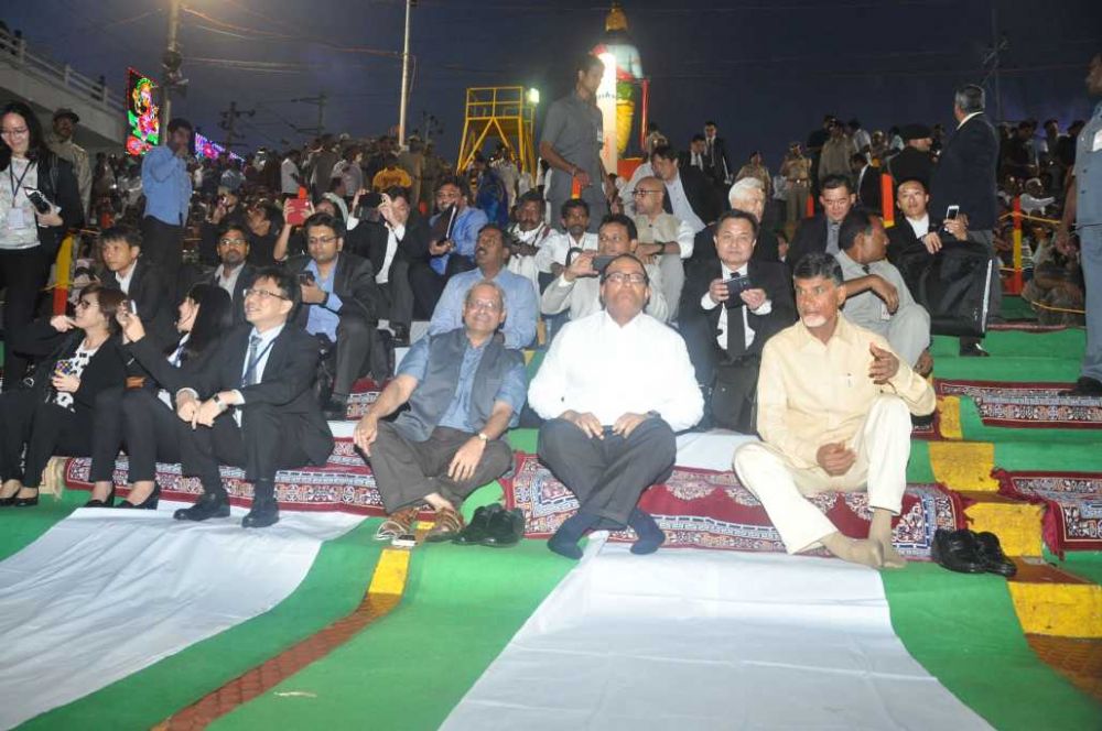 Chief Minister Chandrababu Naidu and Singapore Minster Iswaran participated in Godavari Harathi on Monday. Rajahmudry MP Murali Mohan felicitating the Singpore Team on this occassion.
