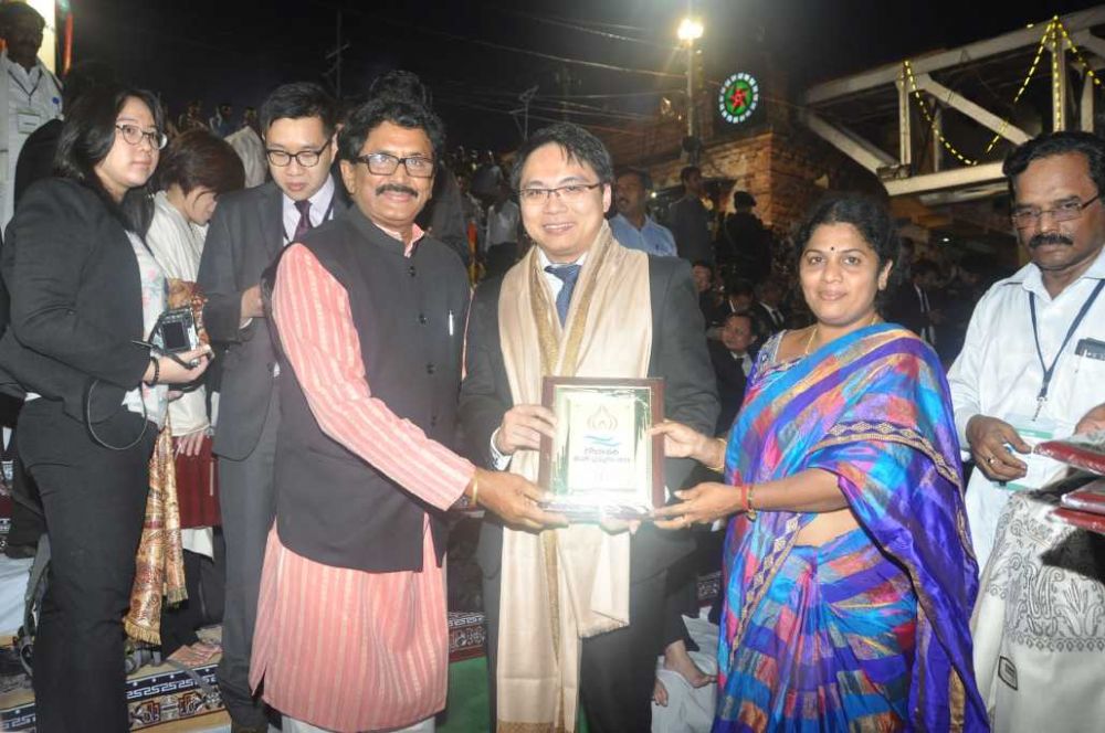 Chief Minister Chandrababu Naidu and Singapore Minster Iswaran participated in Godavari Harathi on Monday. Rajahmudry MP Murali Mohan felicitating the Singpore Team on this occassion.