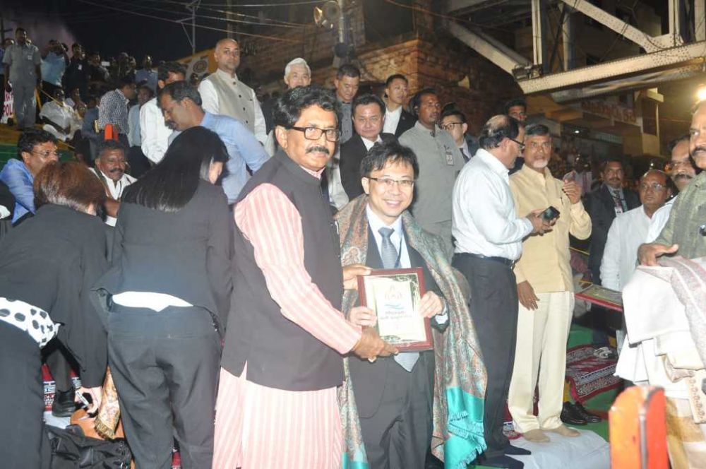 Chief Minister Chandrababu Naidu and Singapore Minster Iswaran participated in Godavari Harathi on Monday. Rajahmudry MP Murali Mohan felicitating the Singpore Team on this occassion.