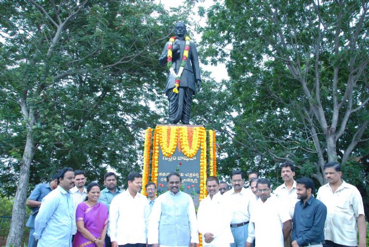 Ravela Kishore Babu, Minister for SWE & TWE Garlanding the statue of Late Gurram Jashuva on the occasion of vardhanthi celebrations at Tankbund, Hyderabad on 24th July 2015.