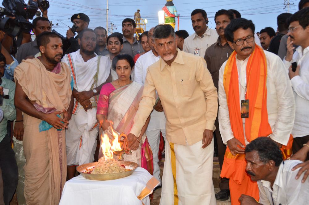 Nitya Harathi performing by Chandrababu Naidu at Godavari Pushkar Ghat on the last day of the 12 day Maha Pushkaram in Rajahmundry on Saturday.