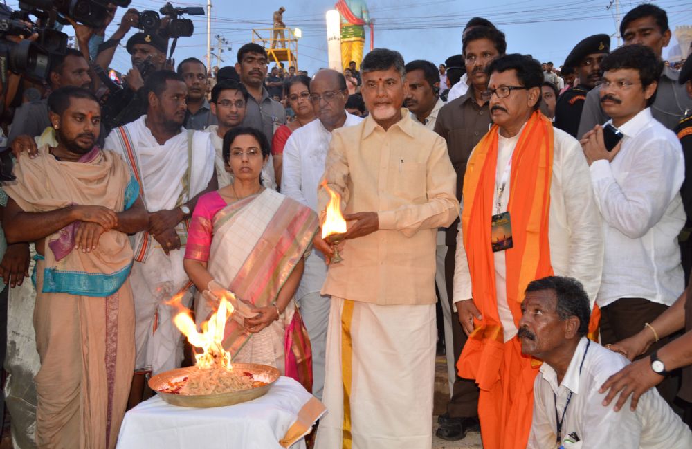 Nitya Harathi performing by Chandrababu Naidu at Godavari Pushkar Ghat on the last day of the 12 day Maha Pushkaram in Rajahmundry on Saturday.