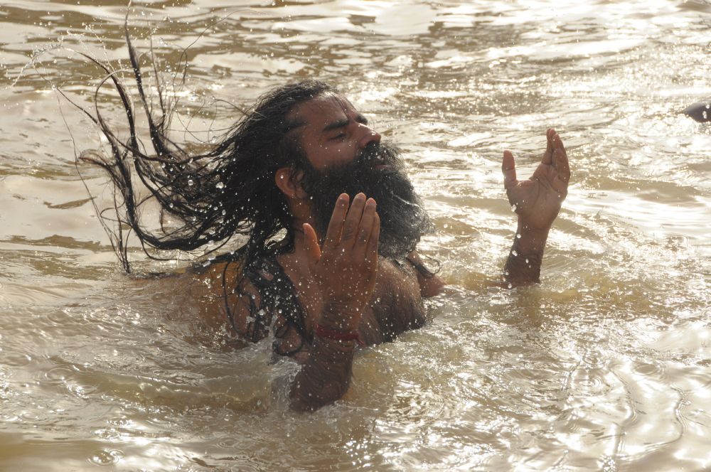 Yoga Guru Ramdev Baba taking Holy Bath in River Godavari at Rajahmudry on the last day of Godavari Pushkaralu on Saturday.