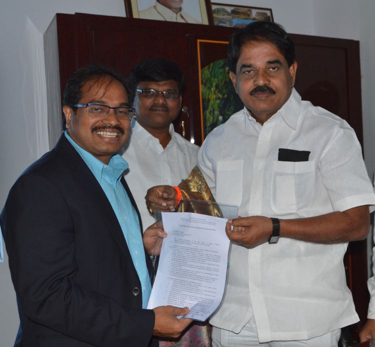 Andhra Pradesh IT Minister Palle Raghunadha Reddy giving appointment letter to Talanki Sridhar as a IT Embassador in USA on 6th August 2015.