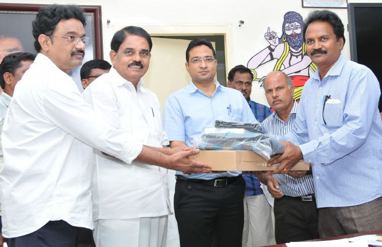 Andhra Pradesh I & PR Minister Palle Raghunadha Reddy distributing TABS to I& PR Officers on August 21, 2015.