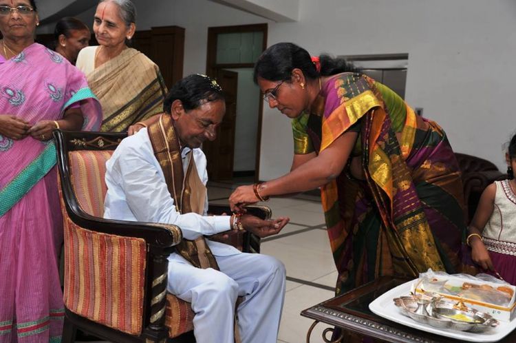 Telangana Chief Minister KCR's sisters tied Rakhi to him at CM camp office on the occasion of Raksha Bandhan on Saturday.