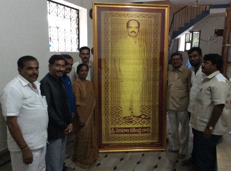 7 feet silk and gold Jarry mixed photo of Paritala Ravindra.