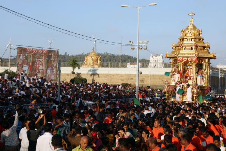 On the sixth day of Srivari Brahmotsavam, the presiding deity Lord Venkateswara gives darshan to his devout followers on the dazzling and bright Swarna Ratham.
