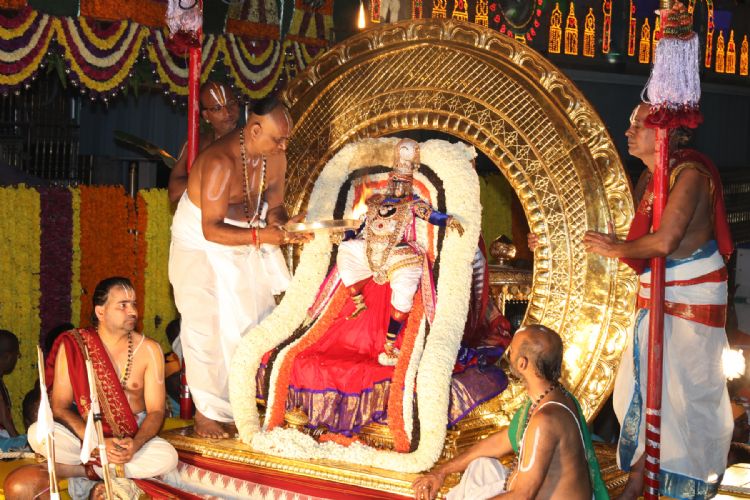 On the evening of seventh day of the Srivari Salakatla Brahmotsavam at Tirumala the presiding deity Lord Venkateswara rides atop a Chandra Prabha Vahanam to the delight of thousands of devotees.