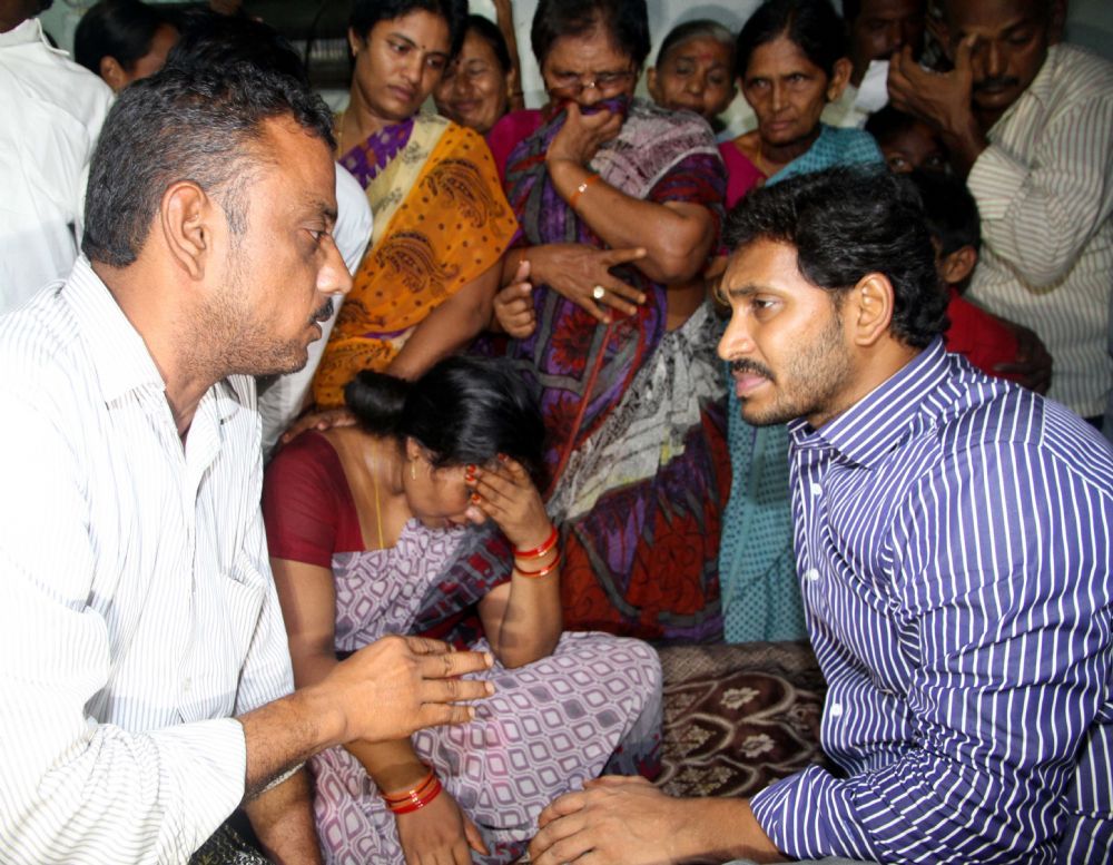 YS Jagan Mohan Reddy consoling the family members of tobacco farmers who committed suicide in Prakasham District and addressing the public at tobacco auction center in Tanguturu on 1st October 2015.