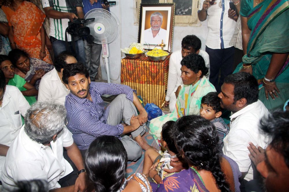 YS Jagan Mohan Reddy consoling the family members of tobacco farmers who committed suicide in Prakasham District and addressing the public at tobacco auction center in Tanguturu on 1st October 2015.