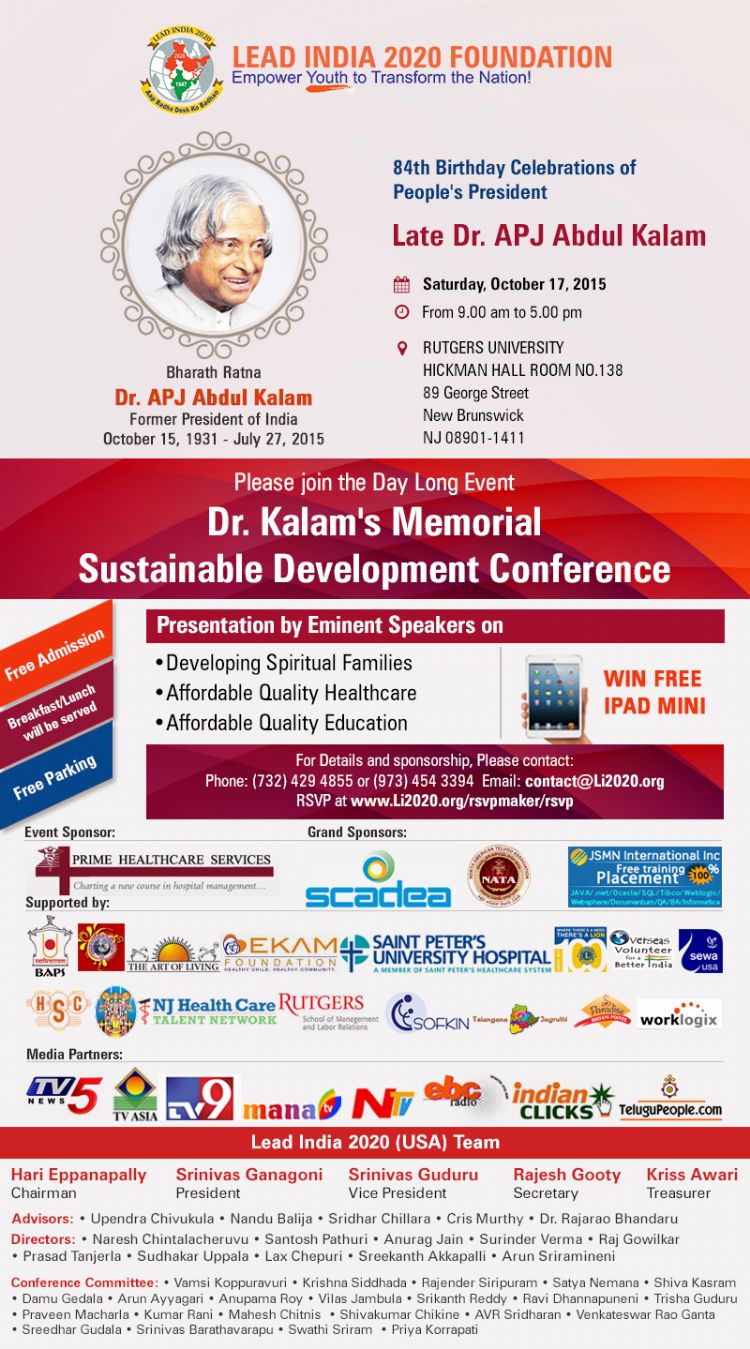 On the occasion of 84th Birthday of President of India, Dr APJ Abdul Kalam, Lead India 2020 USA, is organizing Dr. Kalam’s Memorial- “Sustainable Development” Conference on Saturday, October 17, 2015 from 9.00 am to 5.00 pm at Rutgers University in New Jersey, USA.