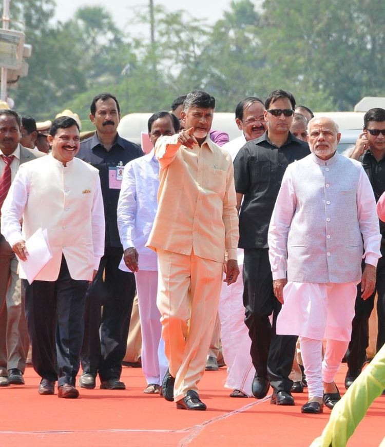 Narendra Modi Prime Minister of India seen Laying foundation stone for the New Capital City (Amaravati) of Andhra Pradesh at Uddandurayanupalem, Guntur District. Sri E.S.L. Narasimhan Governor, N.Chandrababu Naidu Chief Minister of AP & K.Chandrasekhar Rao Chief Minister of Telangana and other Dignitaries are also seen