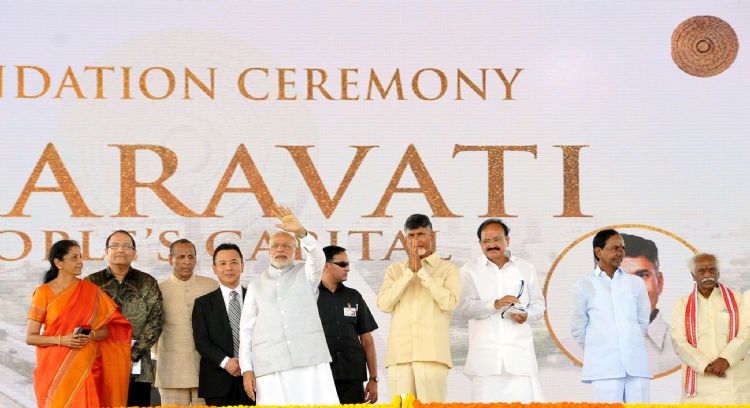Narendra Modi Prime Minister of India seen Laying foundation stone for the New Capital City (Amaravati) of Andhra Pradesh at Uddandurayanupalem, Guntur District. Sri E.S.L. Narasimhan Governor, N.Chandrababu Naidu Chief Minister of AP & K.Chandrasekhar Rao Chief Minister of Telangana and other Dignitaries are also seen