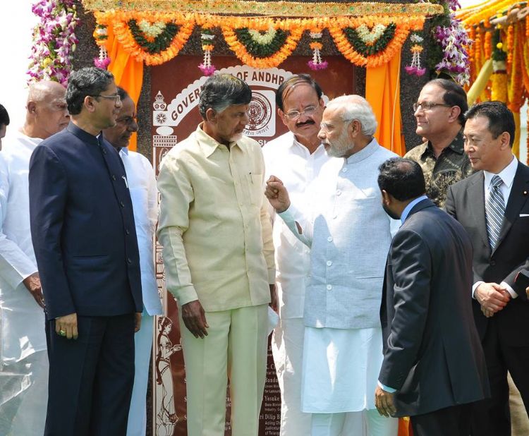 Narendra Modi Prime Minister of India seen Laying foundation stone for the New Capital City (Amaravati) of Andhra Pradesh at Uddandurayanupalem, Guntur District. Sri E.S.L. Narasimhan Governor, N.Chandrababu Naidu Chief Minister of AP & K.Chandrasekhar Rao Chief Minister of Telangana and other Dignitaries are also seen
