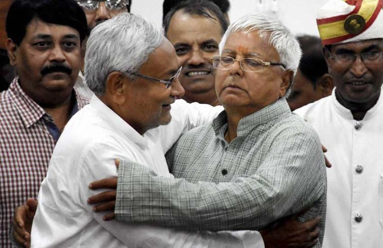 Bihar Chief Minister Nitish Kumar and RJD chief Lalu Prasad Yadav greet each other after Grand Alliance victory in Bihar assembly elections at RJD office on Sunday.