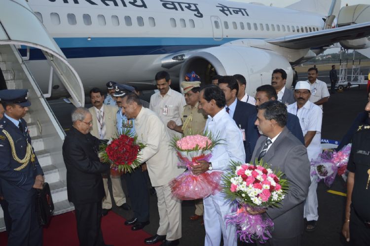 Telangana Governor ESL Narasimhan and Chief Minister K. Chandrasekhar Rao along with other dignitaries are seen receiving President of India Pranab Mukherjee at Hakimpet Airport on 18th December 2015.