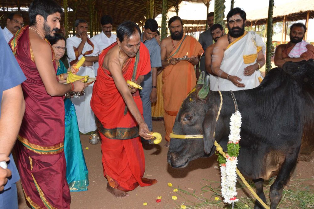 Telangana Chief Minister K. Chandrashekar Rao, along with family members, on Monday performed inaugural pooja in connection with 'Chandi Yagnam' being conducted at his farm house in Yerravelli of Medak district.