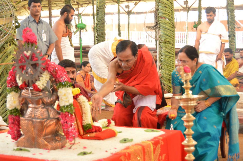 Telangana Chief Minister K. Chandrashekar Rao, along with family members, on Monday performed inaugural pooja in connection with 'Chandi Yagnam' being conducted at his farm house in Yerravelli of Medak district.